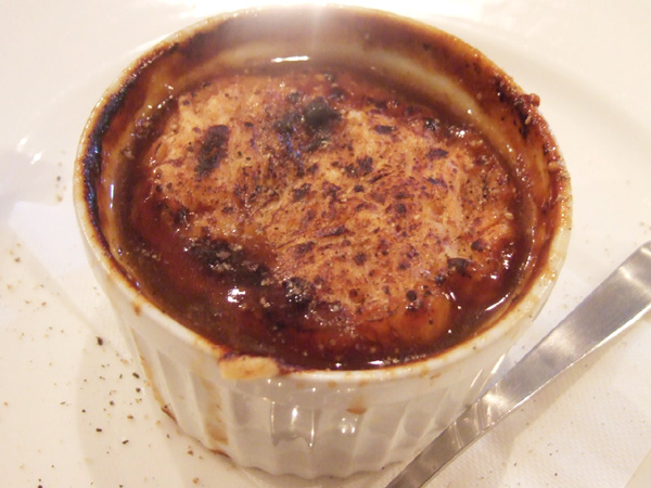 Menu B(4000円・外税)のスープ 自家菜園有機オニオングラタンスープのフォアグラのせ(コースに+857円・外税)
