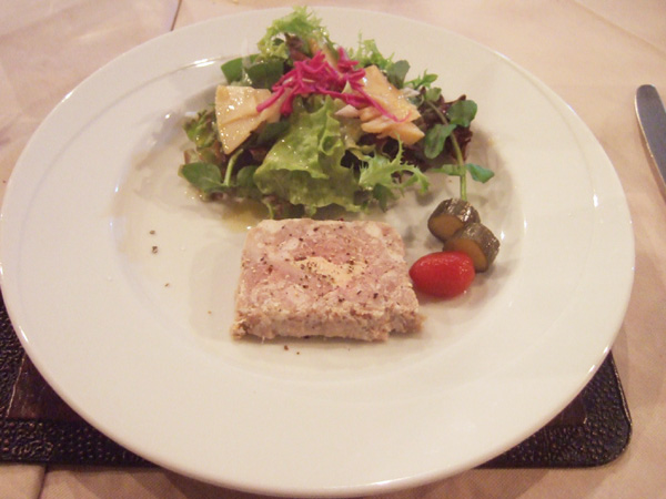 サンク・オ・ピエ ジビエ尽くしのコース2014(6800円)の対馬産イノシシの自家製スモークハムと壱岐産網取り青首鴨のテリーヌ、フォアグラ風味 自家菜園のサラダ添え