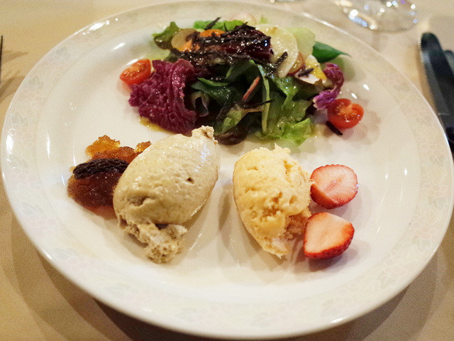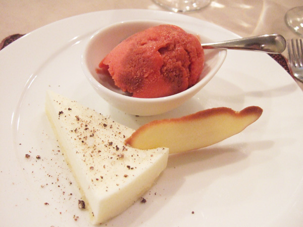 4月5月のコース2014(5400円・外税)のクリームチーズのムース ゲランド産のフルール・ド・セルとポワブル・ロング風味、フランス産完熟イチゴのソルべ 熟成バルサミコ風味、シェフ風ラング・ド・シャ