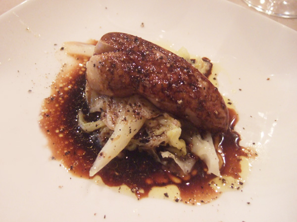 サンク・オ・ピエ4月5月のコース2014(5400円・外税)のランド産鴨のフォアグラのヴァプール、春キャベツ添え、バルサミコソース