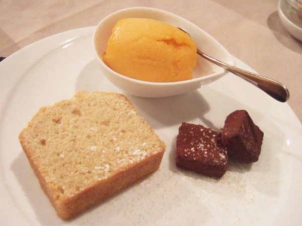 サンク・オ・ピエ フランス特選食材のコース(6500円・外税)のブレス産AOCバター使用のパウンドケーキ、フランス産アプリコットのソルベ、生チョコパヴェのコアントロー風味