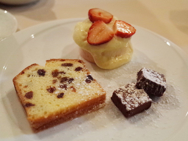 AOCブレス産バターとモンバジャックの貴腐ワインでマリネしたレーズンのパウンドケーキ、ヴァローナ社マンジャリのパヴェ・ド・ショコラ、イチゴのムースグラッセ クレーム・パティシェール