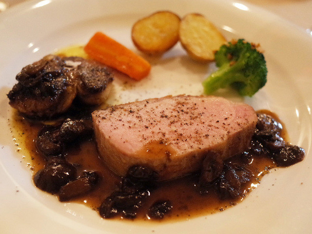 プレクリスマスコース(8500円・外税)のハンガリーの国宝!マンガリッツァ豚の背肉のロースト、フォアグラのソテー添え マデラ酒風味のフランス産マッシュルームのソース