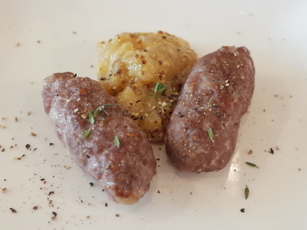 ・対馬産イノシシの皮無しソーセージのグリル、自家製りんごのモスタルダ添え