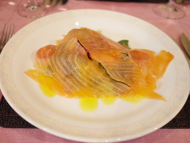 Menu B(4000円・外税)の前菜1皿目 豊後水道イサキのカルパッチョ(本日のスペシャル前菜)