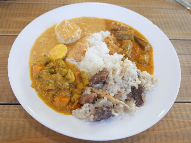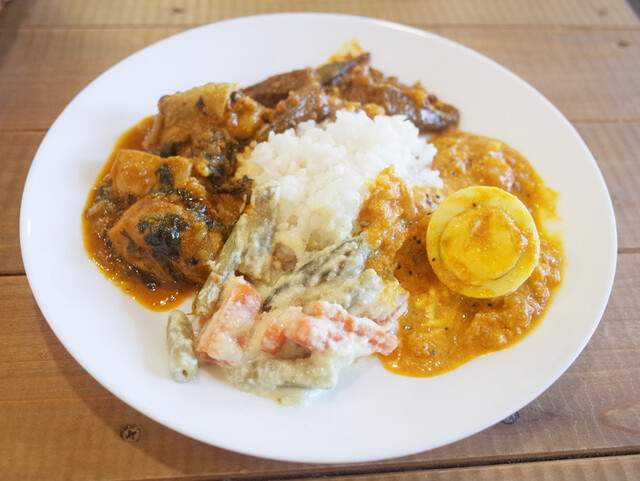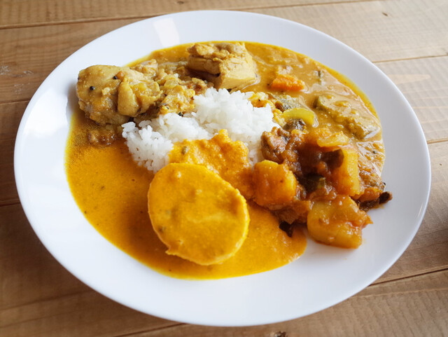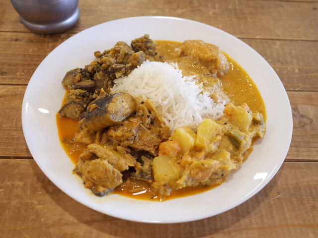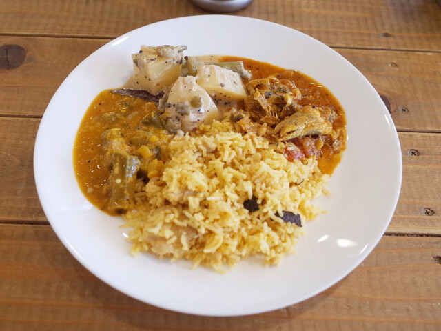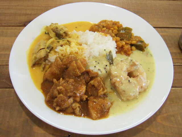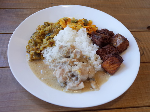 この日は塩チキンカレー、エビのココナッツカレー、オクラの豆カレー、タマネギカレーでした。