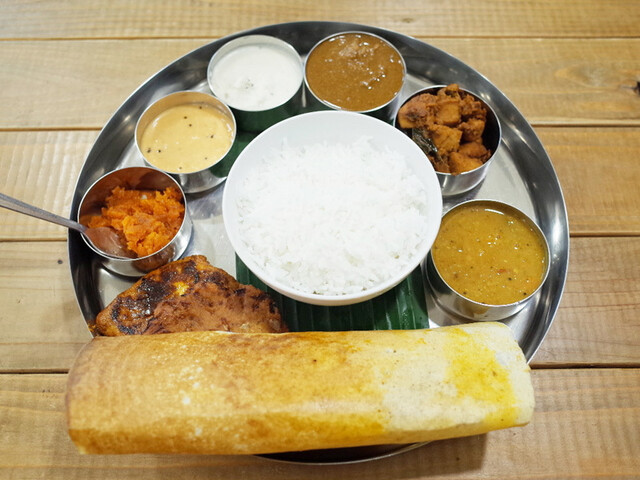 ガーリックチキン、アレッピーフィッシュカリー、ビンディチャナダルマサラ(オクラと豆のカリー)、ワダモールコロンブ(豆のスナック入りヨーグルトカリー)