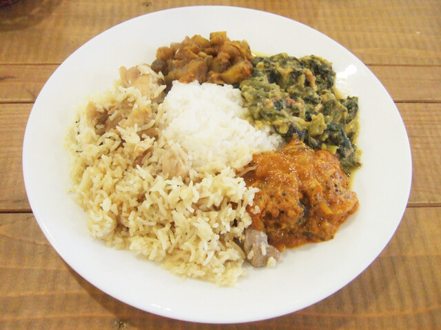 この日のメニューはチキンビリヤニ、マラバールフィッシュカリー(鯖カレー)、ほうれん草と豆のカレー、ごぼうとひよこ豆のカレー。