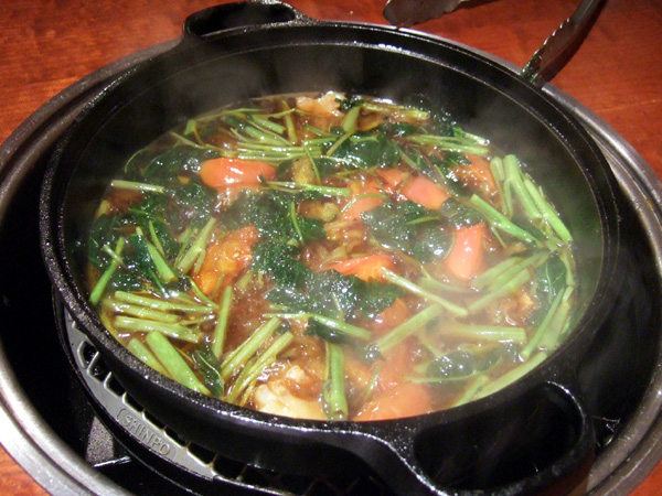 空芯菜とトマトの鍋。シルクロースとヒレも投入してすき焼きちっくにいただきました