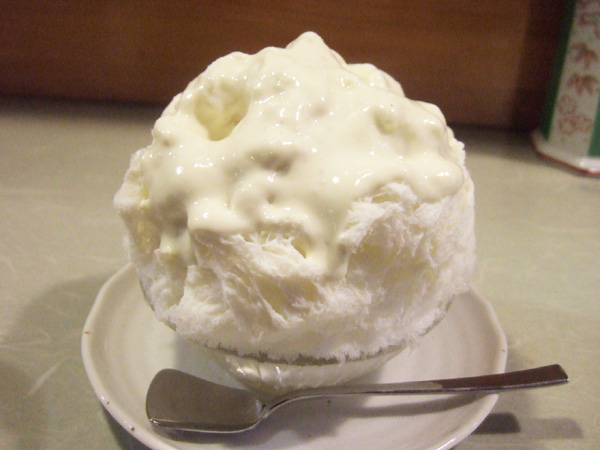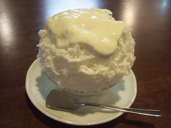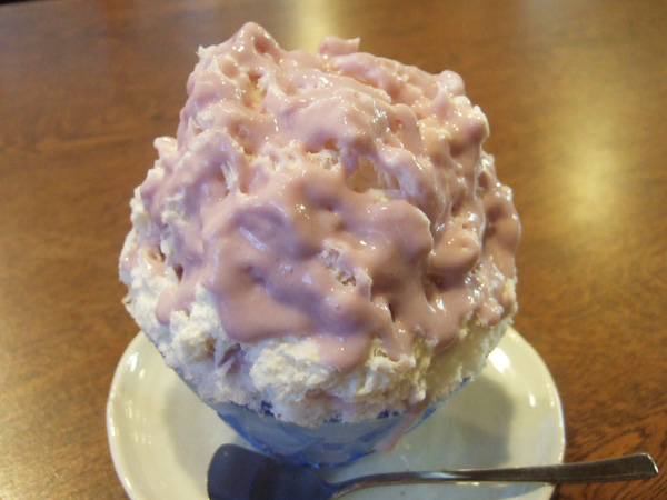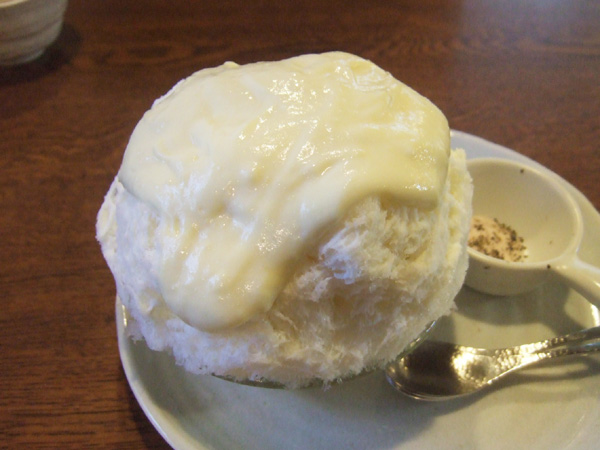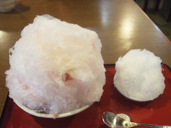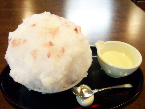爽やかな甘みの桜みつが美味しい。ミルクをかけるとまたガラッと風味が変わってこれまた美味しい!