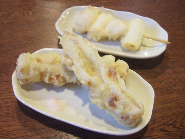 ちくわ天(150円)とささみとねぎの串天(150円)