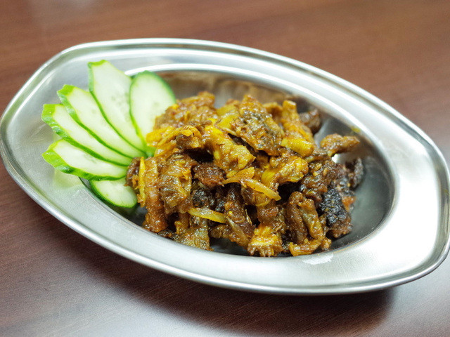 ネパールセット(1250円) この日はジャガイモと青唐辛子とキュウリのタルカリ、ムラコ・アチャル(大根の漬物)、マトンカレーなど。