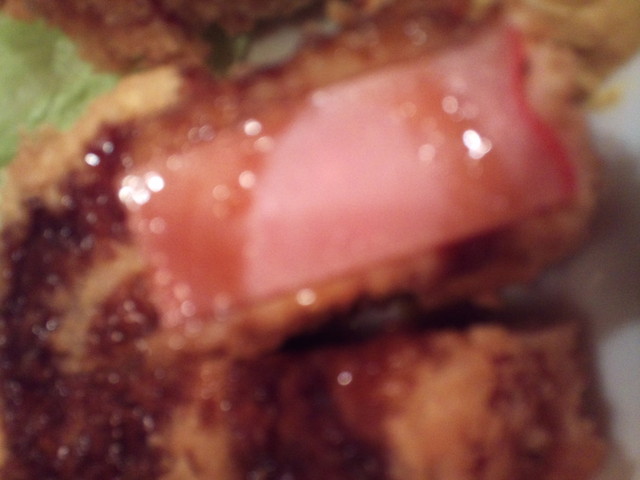噂にたがわず厚切りのハムは、厚さ2cmほどのハムに衣が付いてきたという感じのボリュームでほんのり暖かいハムと控えめな衣が絶妙です。ハムはそんなに高級なハムではないところがまた宜しい。トマトがなくなったので、トマトハイにチェンジ。揚げ物にトマトハイはよく合います。