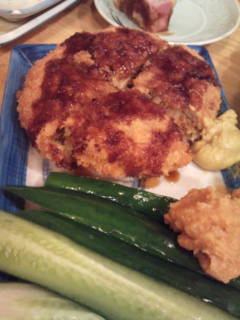 昆布締めの仕事には申し訳ないですが、ぬたの酢味噌に絡めて変化球で、二杯目に突入です。良い調子で切り身が残り半分になったところで、ハムメンチを注文。