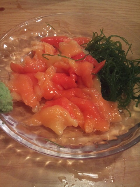 ジムに行く前にちょっとやるかという事になって、こちら大露路を指定。小生先にハイってトマトハイを飲んで〆鯖、鮪ぬたを注文。程なく後輩ちわわが追いつき同じくトマトハイ(小生お替り)で乾杯。しばらくして後輩Nも合流して3時間近くに渡って居酒屋モードでした。