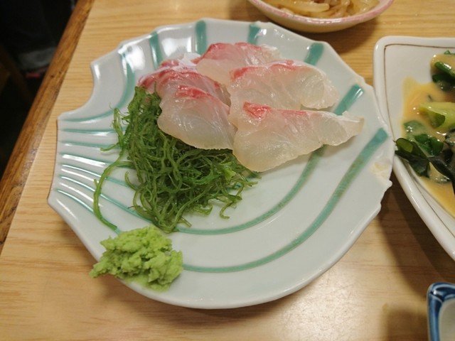 ここの分葱は、一寸太めでかわいくない大きさなのですが、緑の部分の湯通し加減がしゃきっとしており小生は好きです。ほんの形程度に鮪も入っていますが、気にせず葱の香りが程よく残ったぬたと鯛の切り身で、一杯目を干したらおかわりを頼みます。