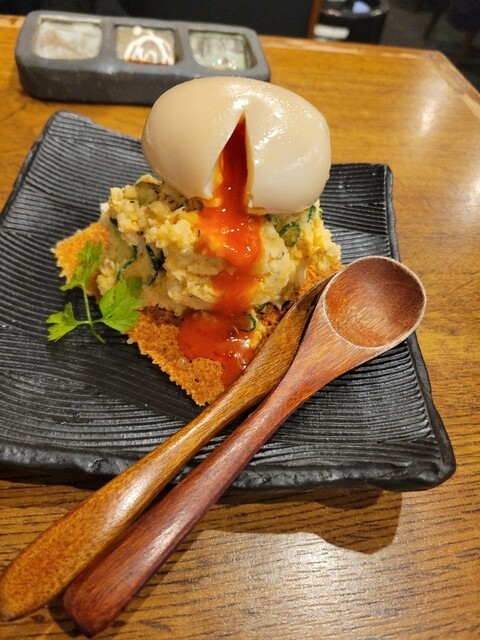 下に敷かれた焼きチーズが新食感、卵の黄身がトロトロなのが良いです
