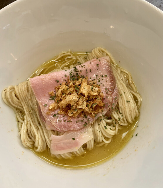 着丼した塩蕎麦は鶏清湯で鶏油が表面を覆う黄金色の美しさ。