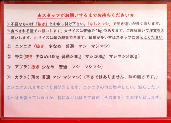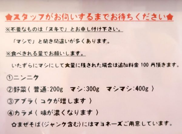 12:20頃入店した僕は店内で2組待った後に着席。眼の前には二郎系らしいこんな張り紙がありました。