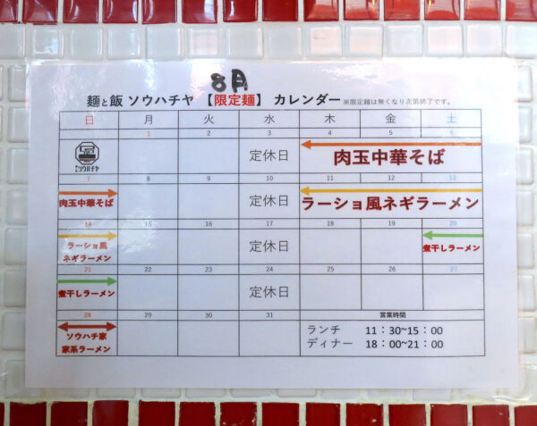 店内には限定メニューのスケジュールが張り出してありました。個人的には来週のラーショ風ネギラーメンがめっちゃ気になります…