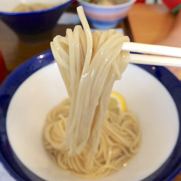 麺はしっかりとした食感で長めです。昆布水だけで食べても美味しいし、歯ごたえと風味がとても好みでした。