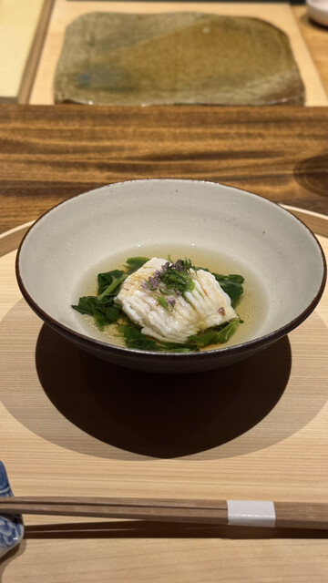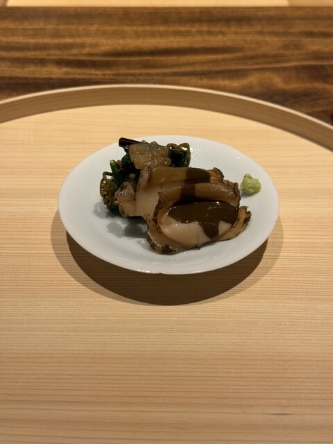 ⑥初物のあわび、ルッコラ、ふき、玉ねぎ餡