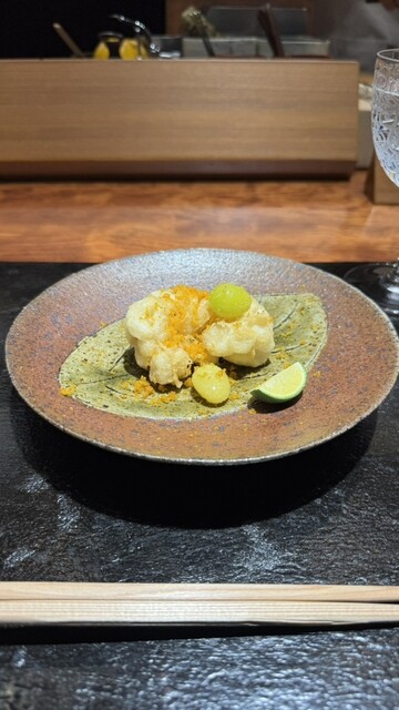 ・たら白子の天ぷら(ビールの衣)、銀杏、自家製カラスミ