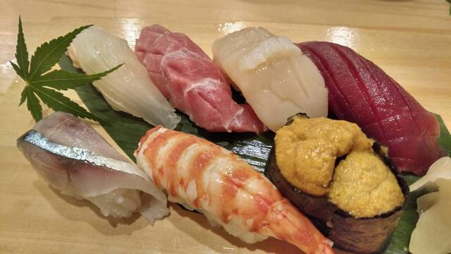 お寿司(中トロ、赤身、ほうぼう、〆サバ、車海老、数の子、うに、いくら)