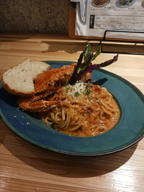 晩餐さんのランチが気になり、おじゃましました。カウンター席で『渡り蟹のトマトクリーム・食後に自家製プリン+ドリップコーヒー』を注文。店内の小洒落た雰囲気を堪能しているとパスタが目の前に。パスタとパスタソースを絡めて1口。美味しい!口の中に絶妙な蟹の味が広がり、パスタの歯応えもあり絶品です。