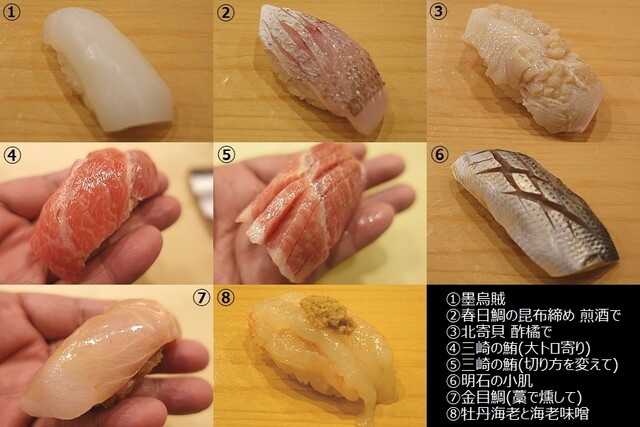 白烏賊、たかべの昆布〆、鯵、赤身、中トロ