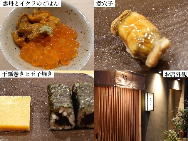 北海道の馬糞雲丹、穴子、干瓢巻き、玉子焼き、お椀