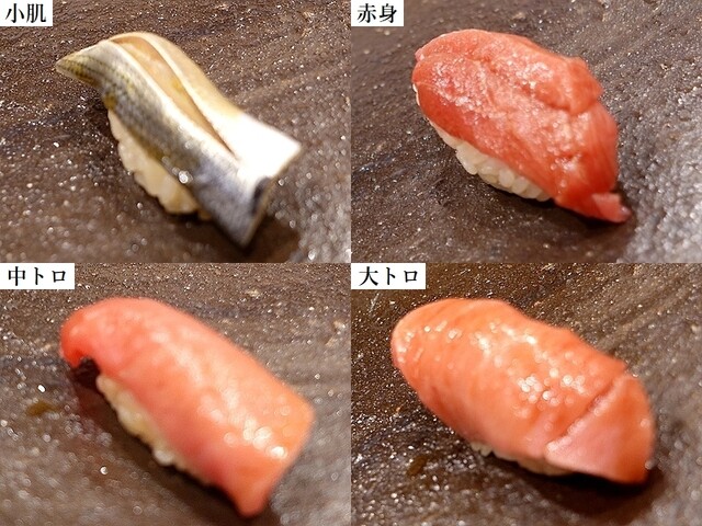 平目、墨烏賊、噴火湾の鮪(赤身漬け、トロのほぐし)