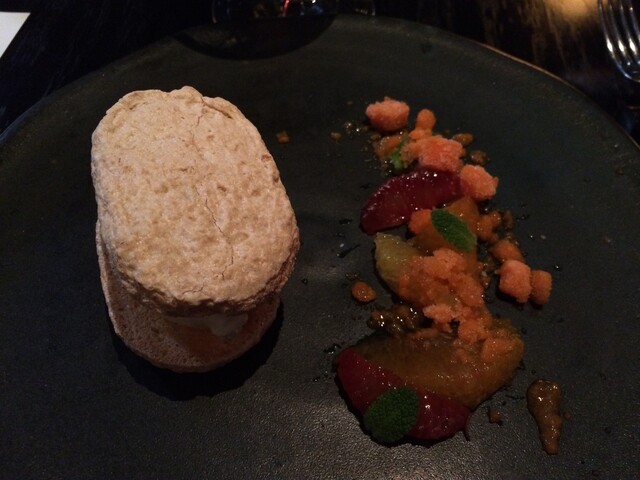 デザート:干し柿と豆腐のアイスクリームを挟んだダックワーズ、柑橘のサラダ、ニンジンとバナナのシャーベット