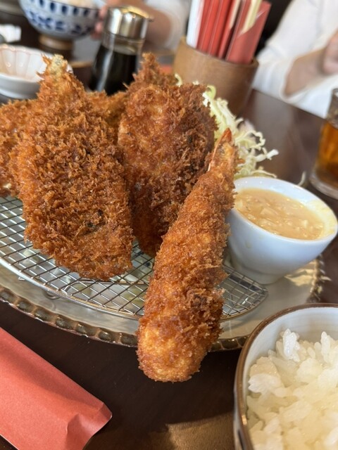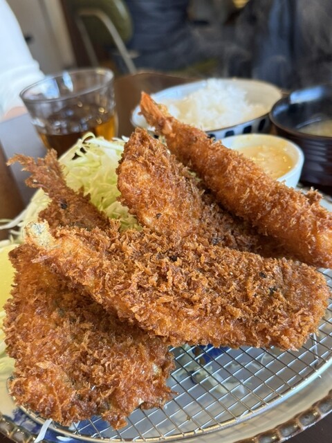 どれも美味しいと聞いていてすごく迷ったけど朝ごはん抜きのペコペコだったのでフライ定食を。かなりのボリュームだけど軽いの揚げ方で意外にも完食できました!ただキャベツだけは少し残してしまった、、残念。