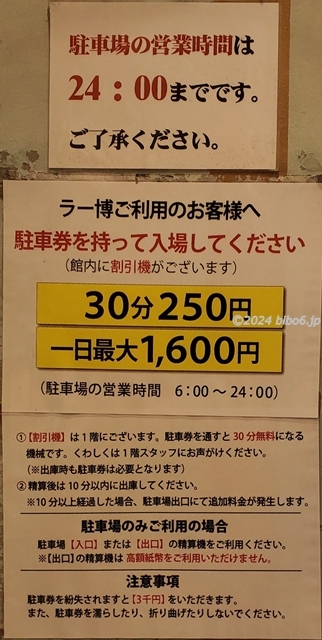 ラーメン博物館には駐車場(250円/30分)があり、入場すると30分無料サービスがあります。ラー博倶楽部の会員になるとランクにより60~120分の無料サービスがあります。この日は車で伺い、開館時間10時30分に伺ったところ階層式の駐車場の4Fに停めました。駐車時間は60分弱でラー博倶楽部の会員向けの無料サービスの範囲内で無料でした。