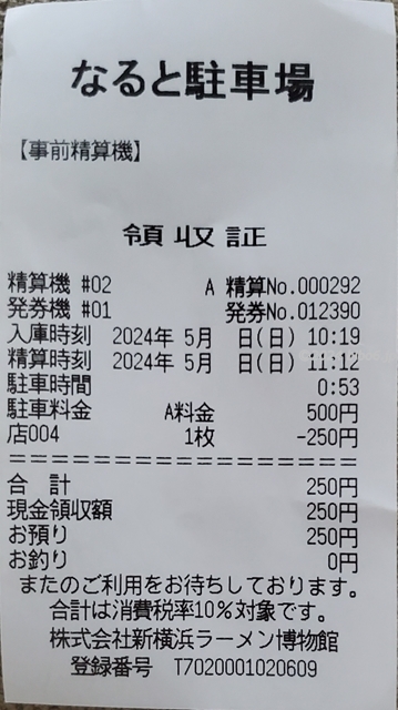 駐車時間は53分で駐車料金は250円(250円割引後)でした。
