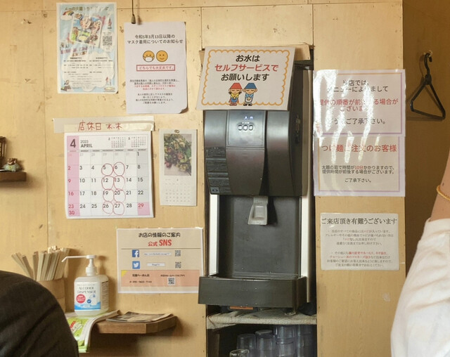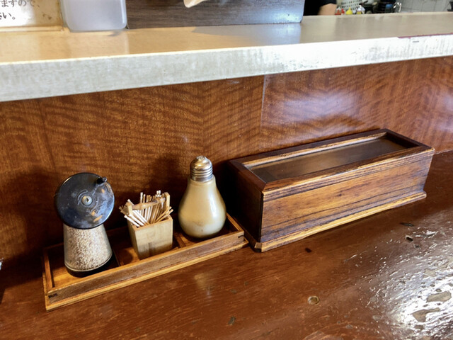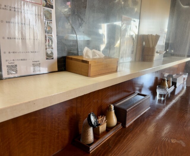 テーブルの上には白胡椒ミル、辛味噌、胡椒、箸、爪楊枝、ティッシュが置いてありました。水はセルフ。厨房には北海道羅臼産赤葉昆布の段ボールが確認できました。