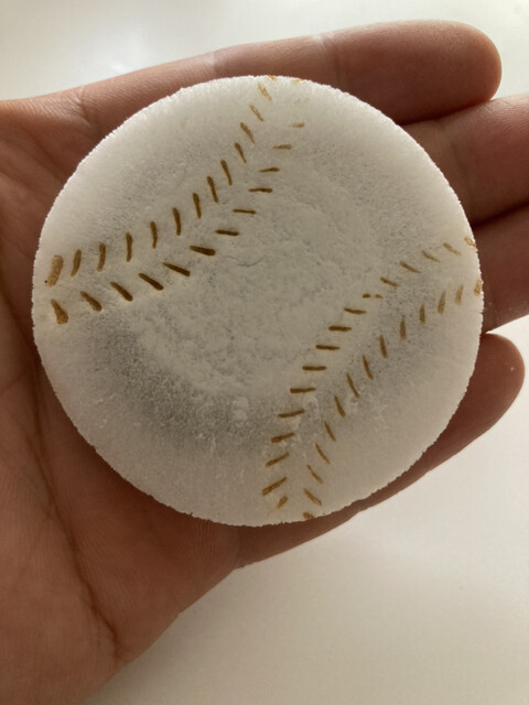 お土産として「球宴」なる最中のようなお菓子も購入。皮が野球のボールの形となっており、さらに縫い目が焼印されています。