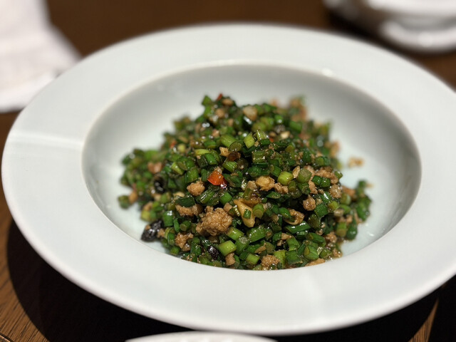 ・松花蒼蠅頭(花ニラとピータン豚挽肉のピリ辛炒め)