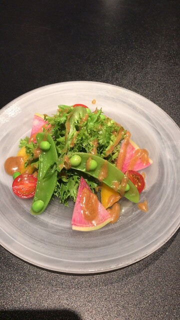 オーガニックサラダ・・ 鞘エンドウと紅芯大根のきれいな彩り。林檎 、沖縄アグニ産塩昆布 赤酢 自家製抽出胡麻油で味付けされた絶妙のコンビネーション。