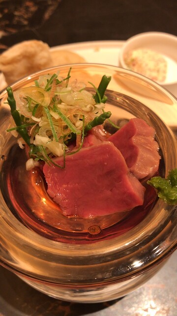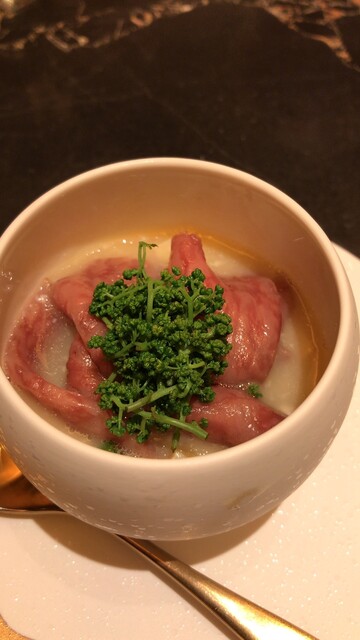 湯葉は国産大豆の香りが残る京都湯葉を使用し、田村牛の鮮度と品質の良さがわかる極限の火の入れ方。それぞれが味を主張し合うが、常識より特性を優先したコラボレーション。