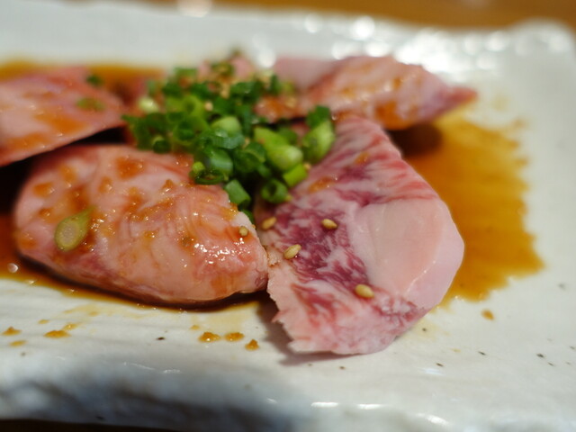 店員さんに勧められて頼んでみました。白い見た目の通り、すごい脂。超高級な霜降り肉の脂だけ食べてる感じかな。