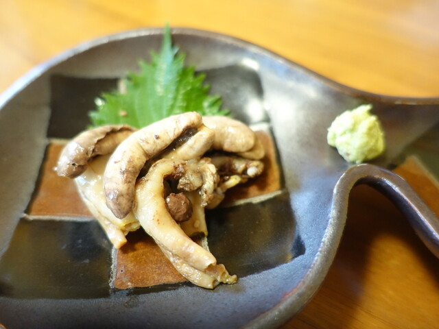 すぐに肝が出てきました。タレか山葵という選択で、山葵を選んだので、わさび醤油でいただきます。くにゅくにゅとした肝の歯応え、美味しいです。全然苦みがない。新鮮な肝は苦くないそうです。レバーも付いていて、柔らかでいい味わい。