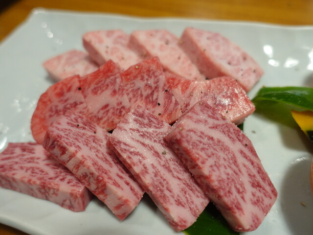 おまかせの特上3種盛りは、ハネシタ、ロース芯、巻きロースでした。ものすごく綺麗なお肉。サシの入り方が見事なのはいつものことながら、カットが美しいのも「たけさん亭」の特徴。