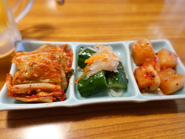 最初にセットの小鉢とキムチが出てきます。小鉢のローストビーフは量が少ないけど美味いです。