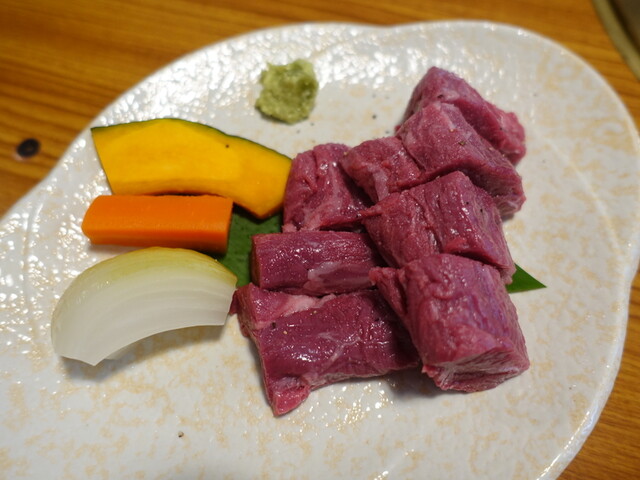 炭とガス併用のロースターで表面をカリッと、中はレアで焼き上げて口に運ぶと、歯でプチプチと細い繊維が噛み切れながら