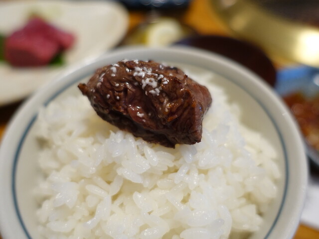 ここは炭火とガスロースターのハイブリッドなので、強い火力で表面をカリッと焼いて、中の脂が溶け出すくらいのレアで食べるのが一番うまい。プチっと歯で噛み切れる繊維の食感と、赤身の肉汁、脂のあまさ。いやあ、絶頂に達します。
