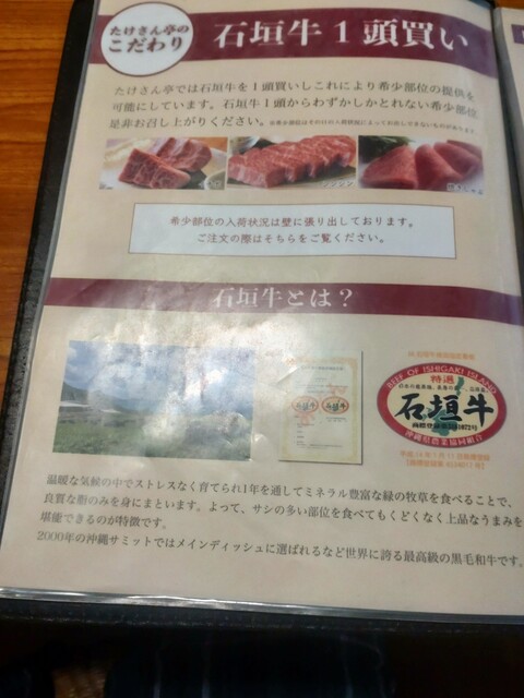 前置きが長くなったが、石垣牛は赤身の部分の味が濃厚で、霜降りでもその赤身の味が脂肪に負けないため、旨味と甘みのバランスが素晴らしいのだろう。たけさん亭はJA沖縄公認の石垣牛を扱う数少ない店のうちのひとつ。炭火焼肉 やまもと、焼肉金城(現石垣島きたうち牧場)の御三家だ。