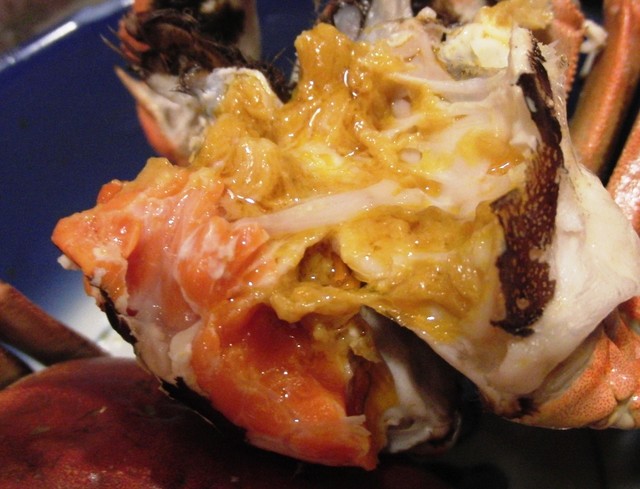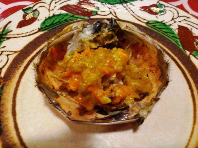 メス2杯でした。本当は10月はメス、11月はオスが美味いと言われてるんですが、そんなの関係ねぇー。 早速甲羅をはずすと、中には真っ赤な内子と、黄色がまぶしい蟹味噌がたっぷり! やったー! むしゃぶりつきました。 うんめぇーーー! 味噌があまーい。