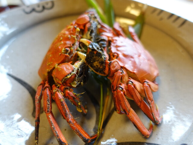 大きな赤い茹で蟹が出てきました。ツガニは関東ではモクズガニです。爪に黒い藻屑が付いています。この玉島川でよく獲れるのだそう。2匹ともメスで、オレンジ色の外子がぷちぷちと美味しい。蟹の身をほじって食べるのは大変ですね。実はこの辺でもう結構おなかいっぱいになっており、1匹は持って帰ることにしました。